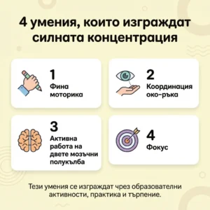 ✔ Развива фината моторика и координацията око–ръка – ключови за писането и увереността при ученето