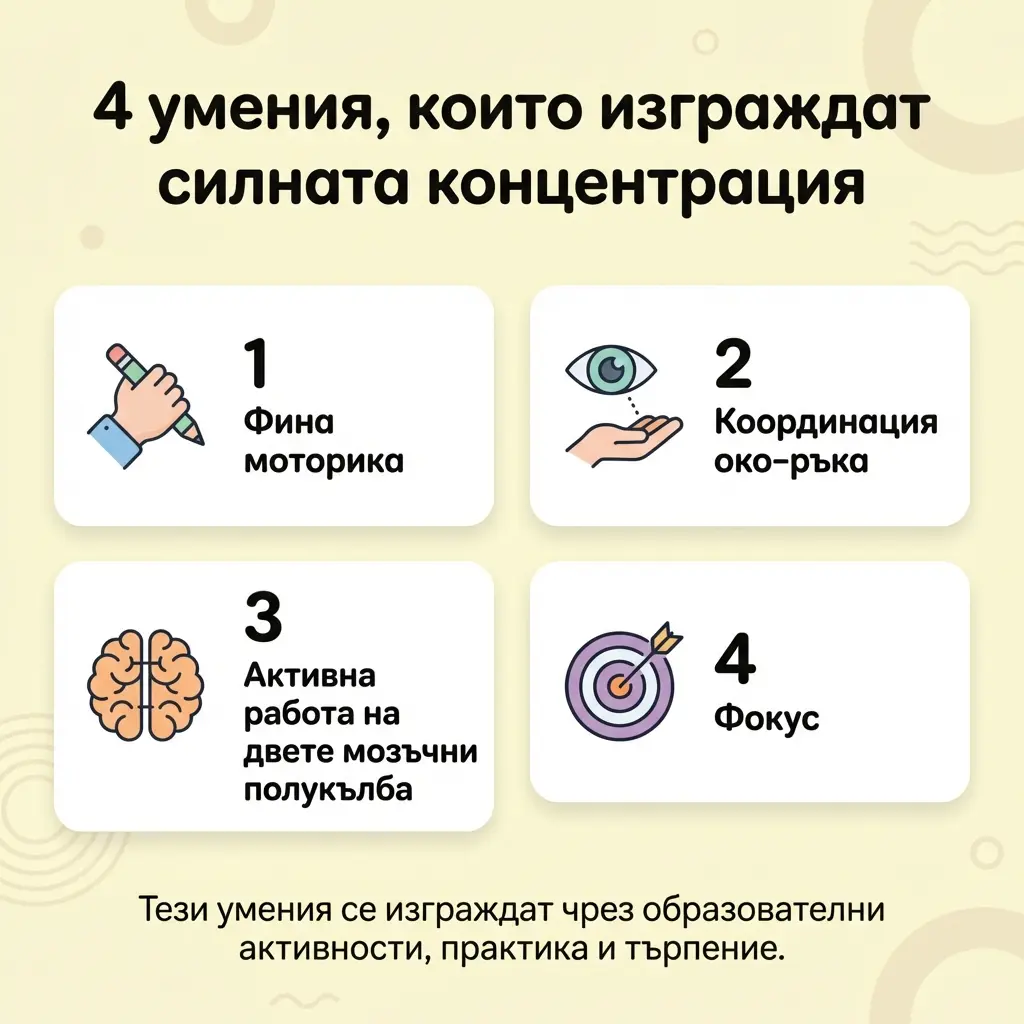 Тези умения са базата, върху която стъпват писането, четенето, концентрацията и самостоятелността.