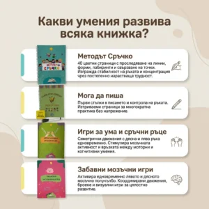 Комплектът „Методът Сръчко + Мога да пиша + Забавни мозъчни игри + Игри за ума и сръчни ръце“ е създаден специално за периода от детското развитие – когато се изграждат основите на ученето.