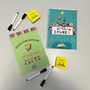 Комплектът включва книжките „Методът Сръчко“ и „Мога да пиша“, както и 4 маркера и 2 гъбички.