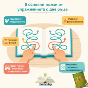 Именно затова упражненията с две ръце подпомагат връзката между моторни и когнитивни умения. Детето не просто движи ръцете си, а учи тялото и ума да работят заедно.