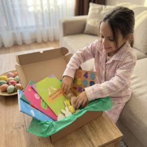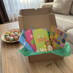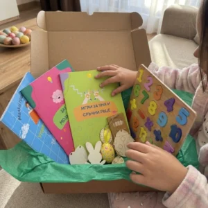 Какво включва кутията? Три образователни книжки -„Игри за ума и сръчни ръце“ (36 стр.), „Забавни мозъчни игри“ (40 стр.) и „Упражнения за фина моторика“ (32 стр.) – плюс великденски бонуси: дървен пъзел с цифри, 4 дървени фигурки „яйце“ за оцветяване, великденско декоративно яйце, кутийка с моливи, дървена фигурка „Калинка“ за оцветяване и фигурка „Великденски заек“.